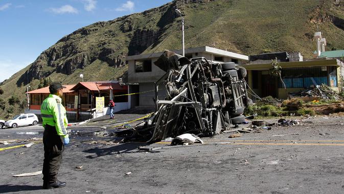 Polisi menyiapkan bantuan kepada kendaraan yang bertabrakan dengan bus pembawa turis asal Kolombia dan Venezuela di Pifo, Ekuador, Selasa (14/8). Saat kecelakaan, bus sedang dalam perjalanan menuju Quito, Ekuador. (AP Photo/Carlos Noriega)