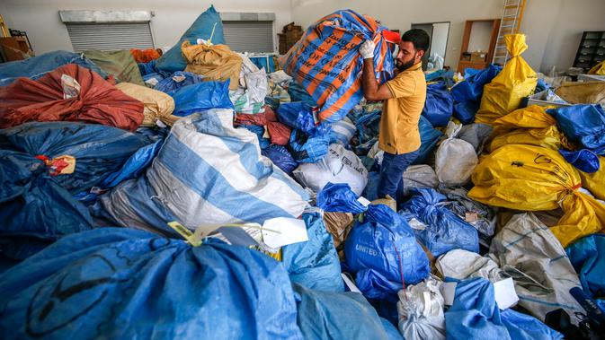 Petugas kantor pos kota Yerikho, memegang setumpuk surat yang sebelumnya diblokade Israel sejak tahun 2010 di Tepi Barat, 14 Agustus 2018. Paket-paket itu mencakup surat, obat, bahkan kursi roda terlihat menumpuk di pusat pemilahan. (AFP/ABBAS MOMANI)
