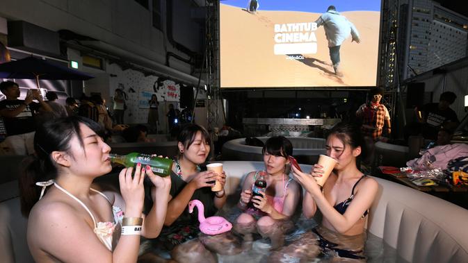 Pengunjung menonton film sambil berendam di Bathtub Cinema di atap gedung Shibuya, Tokyo, 17 Agustus 2018. Acara yang digelar selama tiga hari pada Agustus ini menyajikan film, Jumanji: Welcome to the Jungle, Baby Driver dan Spider Man (AFP/Kazuhiro NOGI)