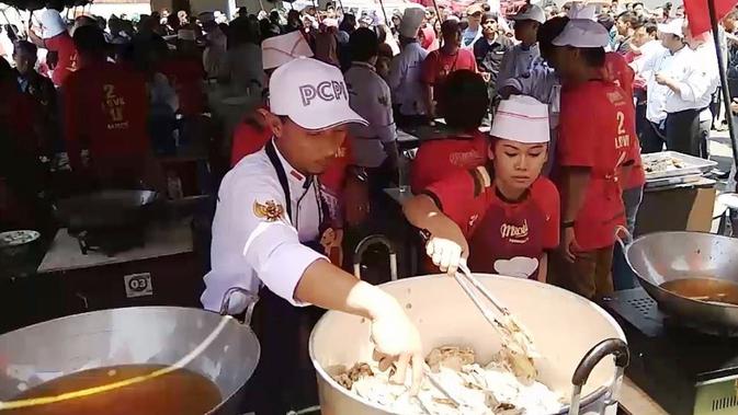 Untuk dapat memecahkan rekor memasak mendoan, dibutuhkan waktu 73 menit dengan menggunakan 45 penggorengan. Ada 135 orang yang berjibaku dalam proses menggoreng ini.