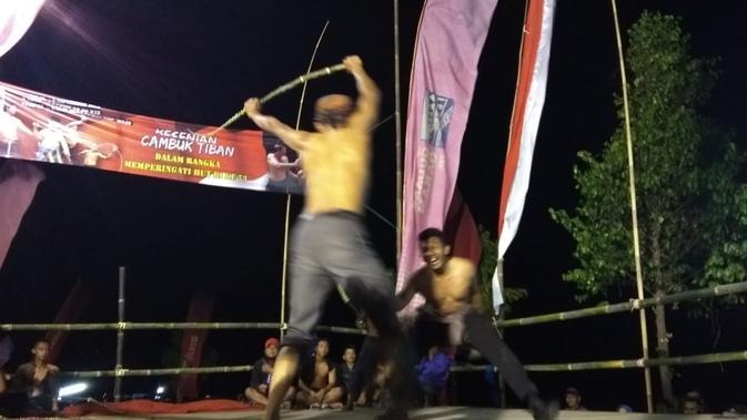 "Kesenian Cambuk Tiban ini melibatkan dua orang yang naik di atas gelanggang atau panggung sambil bertelanjang dada," katanya.