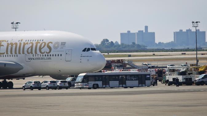 Mobil dan petugas kesehatan mengepung pesawat setelah penumpang Emirates Airline dilaporkan sakit di Bandara Kennedy New York, Rabu (5/9). Belum ada keterangan resmi tentang penyakit yang dikeluhkan penumpang serta awak pesawat itu. (AP/Bebeto Matthews)