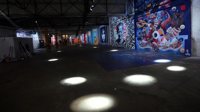 Kreasi seni jalanan ditampilkan sebagai bagian dari pameran "Strokar inside" di bekas supermarket di Brussels (5/9). "Strokar inside" adalah platform seni urban internasional yang diubah menjadi "Supermarket versi 4.0". (AFP Photo/Emmanuel Dunand)
