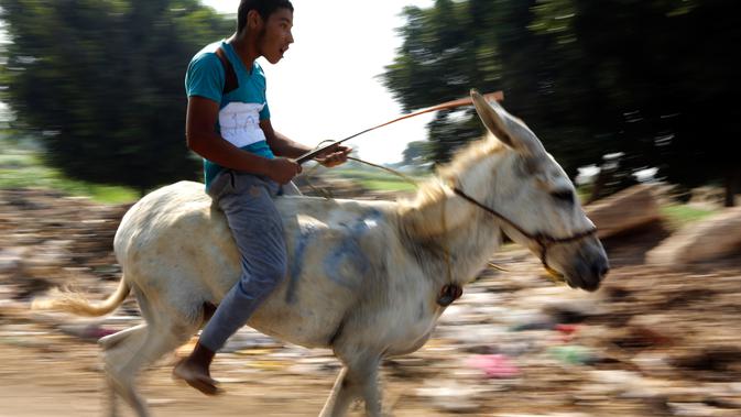 Para peserta memacu keledainya saat ambil bagian dalam lomba balap keledai di desa Al-Baragel, luar Kairo, Jumat (28/9). Sebanyak 35 keledai berpartisipasi dalam kompetisi tahunan yang berhadiah 5000 EGP atau sekitar 4 juta rupiah. (AP/Amr Nabil)