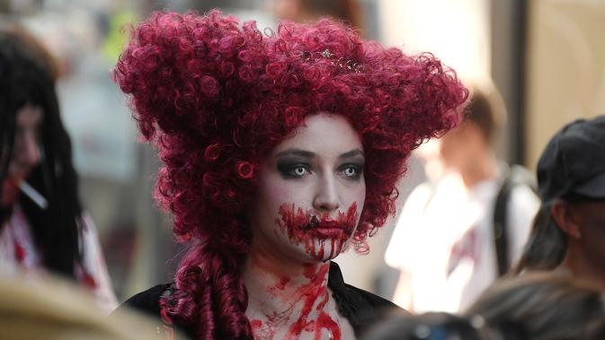 Seorang wanita memakai kostum dan dandanan menyerupai zombie saat acara Zombie Walk di kota Strasbourg, Prancis, 15 September 2018. Acara ini dalam rangka Festival Film Fantasi Eropa ke-11 yang berlangsung dari 14 - 23 September. (FREDERICK FLORIN/AFP)