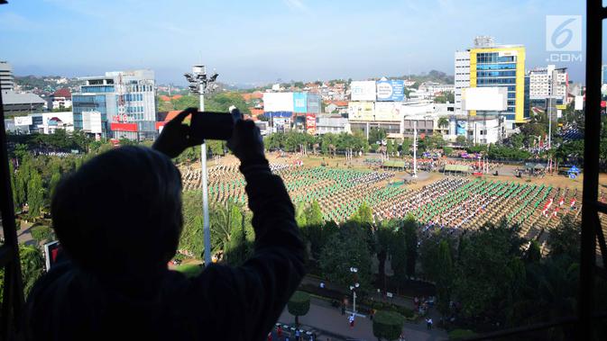Peserta melakukan tari Gemu Famire untuk memecahkan rekor MURI juga merayakan HUT ke-73 TNI di Simpang Lima Semarang, Selasa (4/9). Dalam melakukan tari Gemu Famire, para peserta menggunakan seragam olahraga angkatan masing-masing . (Liputan6.com/Gholib)