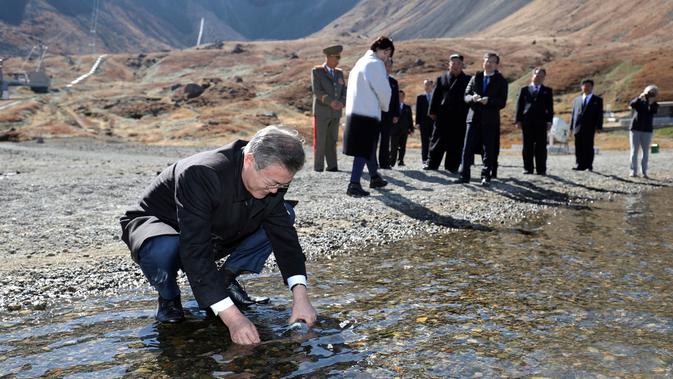 Presiden Korea Selatan Moon Jae-in ditemani istrinya, Kim Jung-sook melihat air kawah Gunung Paektu, Kora Utara, Kamis (20/9). Gunung Paektu merupakan gunung berapi yang dianggap sakral di Korea Utara. (Pyongyang Press Corps Pool via AP)