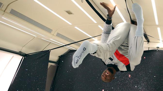 Sprinter Jamaika, Usain Bolt (tengah) mencoba berlari saat mencoba ruangan gravitasi nol dalam pesawat Airbus Zero-G di Reims, Prancis, Rabu (12/9). Bolt terlihat terus tersenyum saat melakukan aksi tersebut. (Laurent Theillet, Mumm/Novespace via AP)