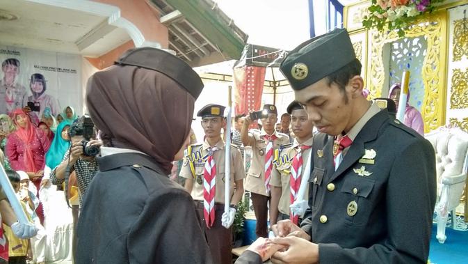 Liputan6.com, Lampung - Ratusan pasang mata memandangi pasangan pengantin ini. Anda Putra Maslyta dan Ellyana Pratiwi, warga Lampung ini menikah dengan mengenakan seragam Pramuka. Mereka mengenalkan Gerakan Pramuka kepada masyarakat dalam salah satu fragmen penting kehidupannya.