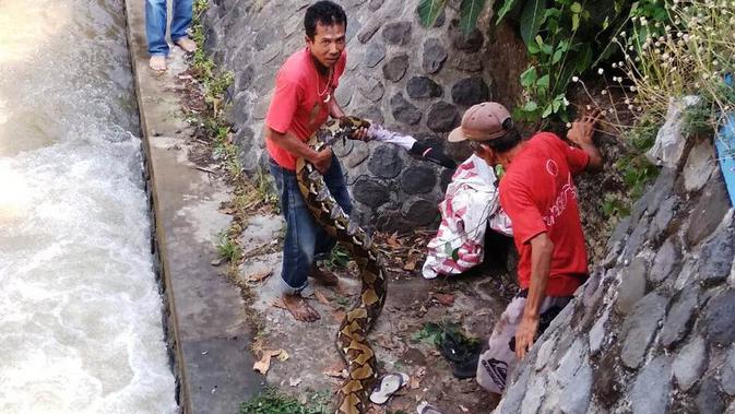 Ular dikeluarkan dari dalam saluran dan menjadi tontonan warga. "Bisa ditangkap, sementara diamankan dulu dalam kandang di rumah," tandasnya.