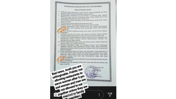 Liputan6.com, Bireuen - Selebaran standardisasi warung kopi di Aceh yang mengatasnamakan Pemkab Bireuen membuat heboh jagat maya. Pasalnya, selebaran berisi 14 poin aturan warung kopi bertanda tangan Bupati Bireuen Saifannur tersebut dianggap meminggirkan hak perempuan.