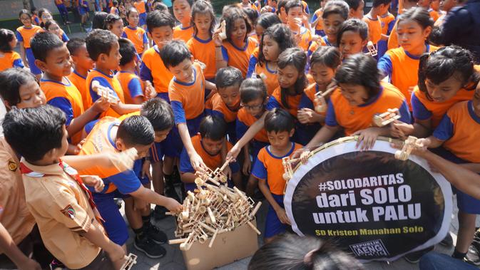 Liputan6.com, Solo - Sejumlah siswa sekolah dasar di Solo melakukan aksi solidaritas untuk para korban gempa dan tsunami Palu dan Donggala dengan cara unik. Mereka mengumpulkan ratusan mainan tradisional othok-othok untuk dikirimkan kepada para korban bencana. Diharapkan mainan yang terbuat dari bambu itu bisa menghibur para korban gempa dan tsunami.