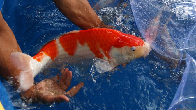 Juri menilai Ikan Koi pada kontes The 4th Cianjur Koi Show 2018 di Cipanas Cianjur, Jabar, Minggu (28/10). Kriteria kontes meliputi keindahan warna, kebugaran tubuh, bentuk ikan yang proporsional serta ikan dalam keadaan sehat. (Liputan6.com/HO/Randi)