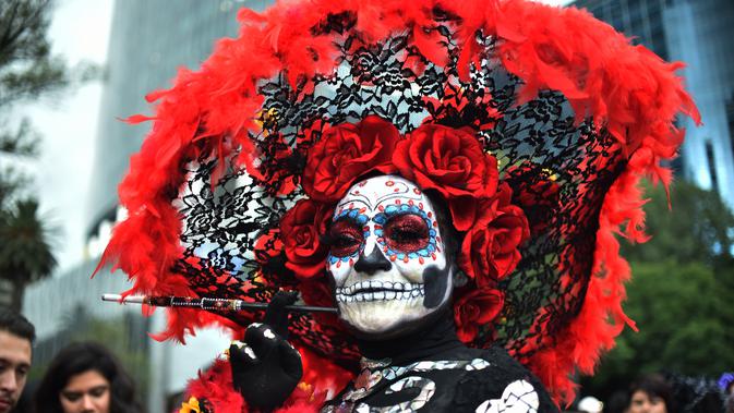 Seorang wanita berpakaian seperti "Catrina" ambil bagian dalam parade Hari Orang Mati di Reforma Avenue, Mexico City, 21 Oktober 2018. Hari kematian ini jadi hari libur nasional di negara-negara Amerika Latin, khususnya Meksiko. (RODRIGO ARANGUA/AFP)