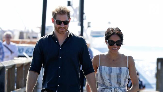 Pangeran Harry dan Meghan Markle saat menghadiri upacara penyambutan resmi di Suva, Fiji, Selasa (23/10. Berdasarkan aturan kerajaan, anak Pangeran Harry dan Meghan Markle adalah pewaris tahta ketujuh Kerajaan Inggris. (AP Photo/Kirsty Wigglesworth, Pool)