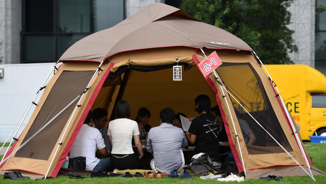 Foto 11 September 2018, karyawan perusahaan bekerja di dalam tenda kemah di halaman luar gedung kantor di Tokyo. Beberapa kantor di Jepang membebaskan pegawainya untuk bekerja di mana saja, mulai dari tenda hingga tempat karaoke. (Toshifumi KITAMURA/AFP)