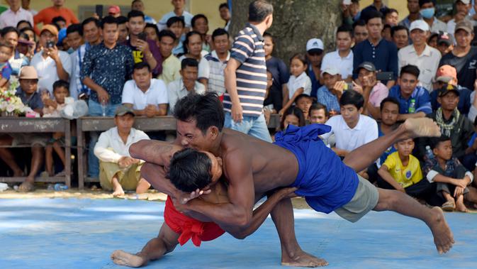 Dua pria bertarung gulat Khmer selama festival Pchum Ben atau festival kematian di desa Vihear Suor, provinsi Kandal (9/10). Warga Kamboja turun dari desa kecil di timur laut ibu kota untuk menyaksikan pertarungan ini. (AFP Photo/Tang Chhin Sothy)