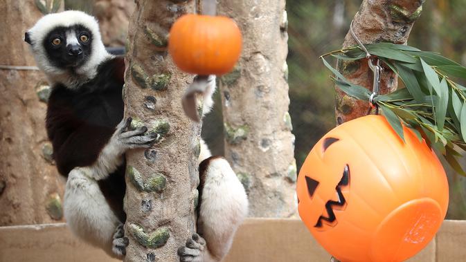 Seekor lemur ekor cincin memakan biji labu yang diletakkan dalam kadang Kebun Binatang San Francisco, California, 26 Oktober 2018. Lemur di kebun binatang itu menerima labu berisi kudapan untuk merayakan Halloween. (Justin Sullivan/Getty Images/AFP)