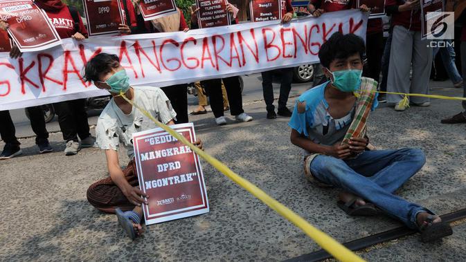Massa Sekolah Antikorupsi Tangerang dan Ikatan Alumni Sekolah Antikorupsi menggelar aksi di depan Gedung IFA, Tangsel, Senin (8/10). Pembangunan Gedung DPRD Kota Tangsel menghabiskan dana sekitar Rp. 200,9 Miliar. (Merdeka.com/Arie Basuki)