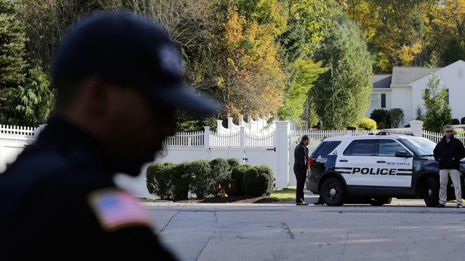 Petugas Secret Service berbincang di pos pemeriksaan dekat rumah mantan Presiden AS, Barack Obama di Washington, Rabu (24/10). Dinas Rahasia AS telah menggagalkan pengiriman paket berisi bahan peledak ke rumah Barack Obama. (AP /Alex Brandon)