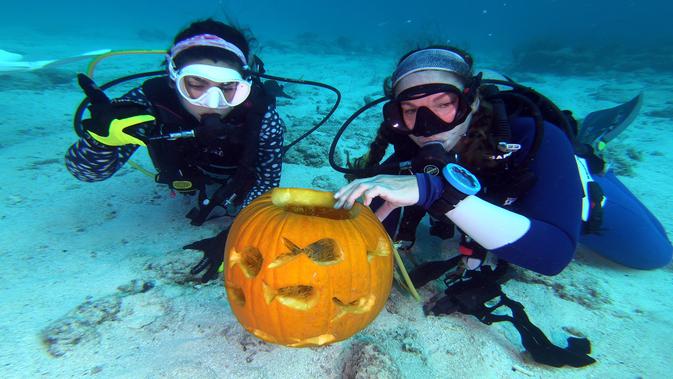 Dua penyelam, Sophie Costa dan Allison Candelmo menunjukkan buah labu dalam Kontes Mengukir Labu Bawah Air, di Cagar Alam Laut Nasional Florida Keys, Florida, Minggu (14/10). Kompetisi diadakan di laut sedalam 9 meter. (Frazier Nivens/various sources/AFP)