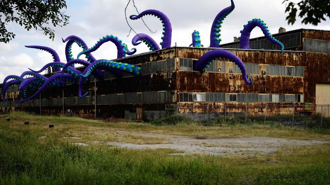 Pengunjung mengambil gambar patung karet "Sea Monsters HERE" di gudang berkarat Building 61 di Navy Yard, Philadelphia, Selasa (9/10). Kreasi sepanjang 40 kaki ini menampilkan tentakel ungu besar yang keluar dari jendela hingga ke atap. (AP/Matt Rourke)