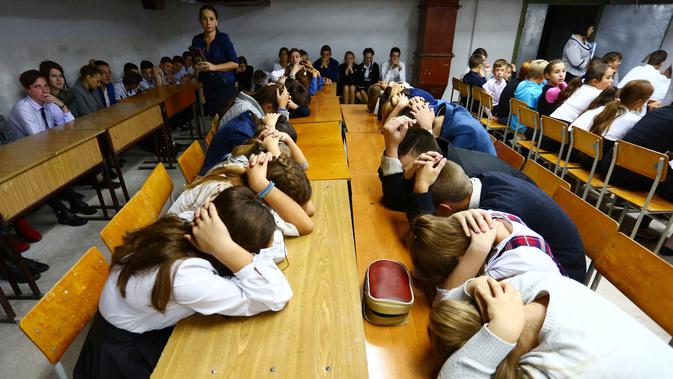 Anak-anak mengambil bagian dalam latihan keamanan di Sekolah Nomor 8, Desa Sartana wilayah timur Ukraina, 2 Oktober 2018. Di sekolah tersebut, para siswa menjalankan latihan menghadapi pengeboman sekali dalam sebulan. (Aleksey FILIPPOV/AFP)