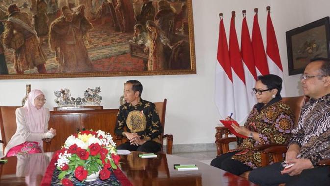 Liputan6.com, Bogor - Presiden Republik Indonesia, Joko Widodo, menerima kunjungan kehormatan Wakil Perdana Menteri Malaysia, Wan Azizah Wan Ismail di Istana Kepresidenan Bogor, Jawa Barat, Selasa (9/10/2018).