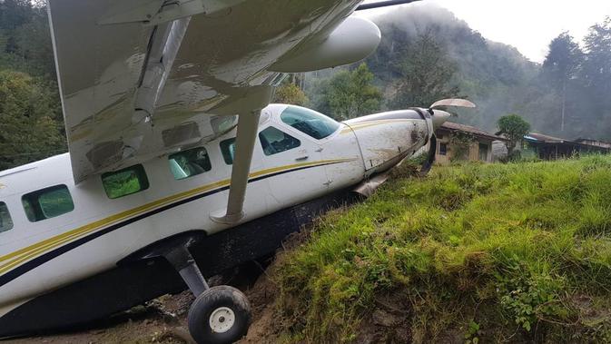 Liputan6.com, Jayapura - Pesawat Cessna Caravan 208EX dengan nomor lambung PK : JBR, milik PT Johnlin Air Transportasi rusak berat, setelah tergelincir dan menabrak gundukan tanah di pinggir lapangan terbang Beoga, Kabupaten Puncak, Papua, Rabu (10/10/2018) pukul 06.22 WIT.