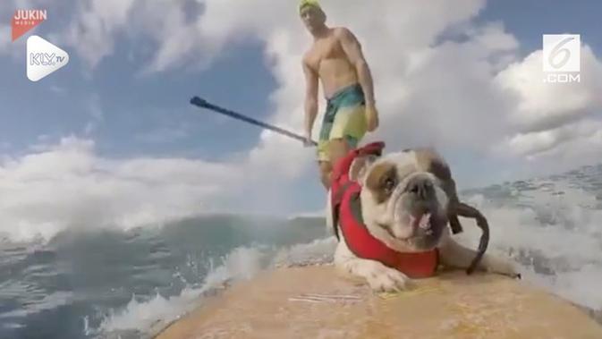 Liputan6.com, Jakarta Bulldog yang menggemaskan ini sedang menikmati saat-saat ketika ia berada di atas papan seluncur pemiliknya yang sedang memecah ombak. Dia hampir kehilangan keseimbangannya, tetapi pemiliknya memegangnya dan mencegahnya jatuh ke air.