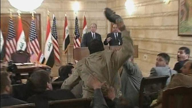 Namun tak disangka, tiba-tiba sebuah sepatu meluncur ke arah Bush. Adalah wartawan Irak, Muntader al-Zaidi yang secara cepat berdiri dan melemparkan sepatu tersebut sambil mengucapkan sumpah serapah.