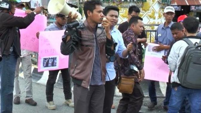 Liputan6.com, Aceh - Puluhan wartawan dari berbagai media di Aceh menggelar aksi solidaritas atas kejadian tragis yang menimpa jurnalis akhir-akhir ini. Aksi unjuk rasa dipusatkan di Monumen Simpang Peut, Kabupaten Nagan Raya, Provinsi Aceh, Selasa, 27 November 2018.