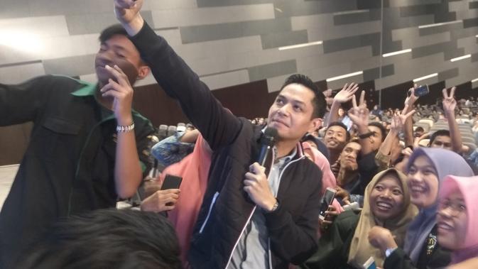 Liputan6.com, Surabaya - Salah satu aktor yang biasa membintangi sinetron di SCTV, Dude Harlino menularkan semangat berwirausaha kepada ratusan peserta Emtek Goes to Campus (EGTC) 2018 di auditorium kampus timur Universitas Kristen Petra Surabaya, Rabu (14/11/2018).