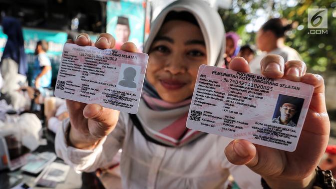 Petugas Disdukcapil menyerahkan form pengajuan Kartu Identitas Anak (KIA) di Pondok Aren, Tangerang Selatan, Jumat (16/11). KIA berisikan nama, alamat, nama orangtua, nomor kartu penduduk, dan sejumlah identitas diri lainnya. (Liputan6.com/Fery Pradolo)