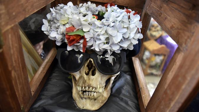 Pemandangan tengkorak manusia yang dihias selama Festival Natitas di pemakaman La Paz, Bolivia, 8 November 2018. Menurut tradisi Andean, orang-orang percaya menjaga tengkorak manusia (natitas) di rumah dapat melindungi keluarga mereka. (AIZAR RALDES/AFP)