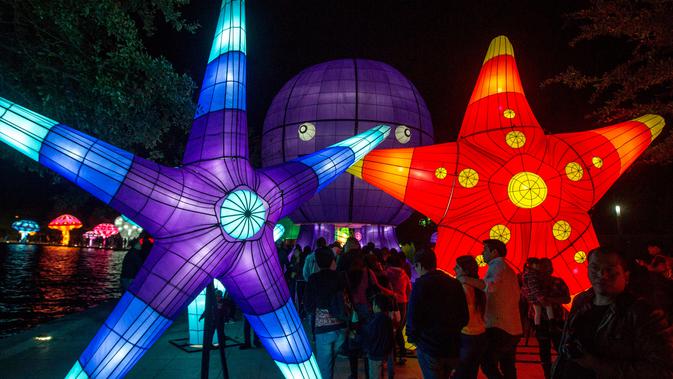 Orang-orang mengunjungi festival lampu dan figur Natal pada awal musim liburan di Paseo Santa Lucia, Monterrey, Meksiko pada 25 November 2018. Festival ini adalah salah satu festival terbesar di Amerika Latin. (Julio Cesar AGUILAR/AFP)