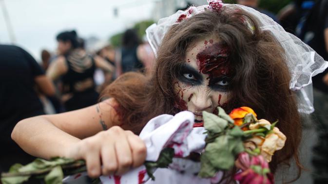 Pengunjung memakai kostum dan dandanan menyerupai zombie dalam acara Zombie Walk di pantai Copacabana, Rio de Janeiro, Brasil, Jumat (2/11). Ribuan orang ini beraksi sebagai Zombie untuk memeriahkan peringatan Hari Para Arwah. (Mauro PIMENTEL/AFP)