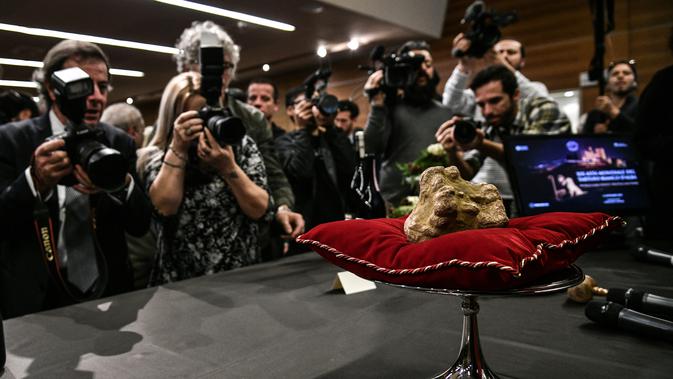Jamur truffle putih langka seberat 850 gram ditampilkan selama lelang World White Truffle ke-19 di Alba, Italia, 11 November 2018. Jamur itu dibeli oleh warga Hong Kong yang dirahasiakan namanya seharga 85.000 euro (Rp 1,5 miliar). (Marco BERTORELLO/AFP)