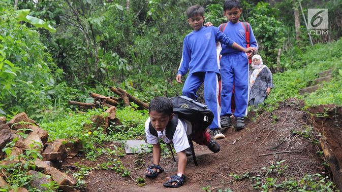 Mukhlis Abdul Holik (8) menuju sekolahnya di Kampung Cikiwul Tonggoh, Sekarwangi, Sukabumi, Kamis (15/11). Kedua tangan menjadi tumpuan Adul menempuh jalanan yang terjal, menanjak, dan menurun demi tiba di sekolah. (Merdeka.com/Arie Basuki)