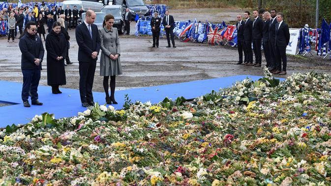 Putra Vichai, Aiyawatt Srivadhanapraba mendampingi Pangeran William dan Kate Middleton untuk memberikan penghormatan kepada korban tewas dalam kecelakaan helikopter di markas Leicester City, Stadion King Power, di Inggris, Rabu (28/11). (Paul ELLIS/AFP)