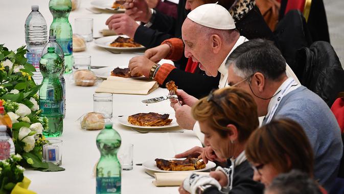 Paus Fransiskus makan siang bersama sejumlah orang miskin di Pope Paul VI hall, Vatikan, Minggu (18/11). Makan siang bersama ratusan kaum papa, tunawisma, dan pengangguran itu memperingati Hari Orang Miskin Sedunia. (Vincenzo PINTO/AFP)