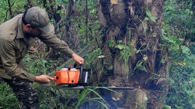 Petugas konservasi menebang pohon kelapa sawit yang ditanam secara ilegal di Taman Nasional Gunung Leuser, Aceh, Kamis (1/11). Forum Konservasi Leuser mengatakan bahwa mereka menghancurkan sekitar 2.000 hektare pohon kelapa sawit ilegal. (JANUAR/AFP)