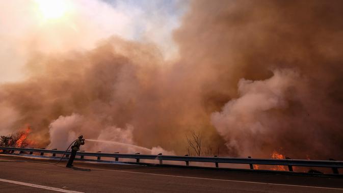 Petugas pemadam kebakaran berusaha memadamkan api di sepanjang Ronald Reagan (118) di Simi Valley, Californnia (12/11). Api Woolsey menjalar ke jalan raya dan menuju kota pesisir, termasuk kawasan wisata Malibu dan Calabasas. (AP Photo/Ringo H.W. Chiu)
