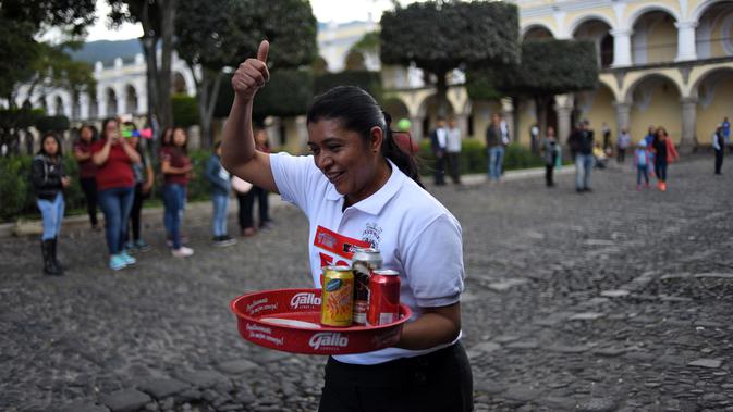 Seorang pramusaji membawa nampan dalam Waiters Race ke-16 di Antigua, barat daya Ibu Kota Guatemala City, Rabu (14/11). Ratusan peserta beradu kecepatan sembari membawa nampan berisi dua minuman ringan, bir dan air. (JOHAN ORDONEZ/AFP)