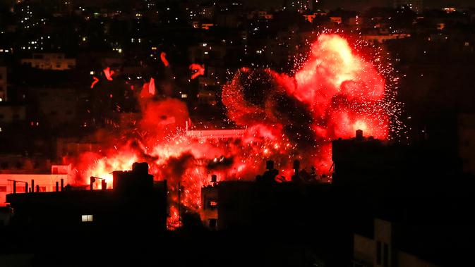 Bola api meledak di atas kantor stasiun televisi Al Aqsa milik Hamas selama serangan udara Israel di Jalur Gaza, Senin (12/11). Serentetan tembakan roket Israel di Gaza menewaskan tiga orang Palestina dan menghancurkan gedung TV Hamas. (Mahmud Hams/AFP)