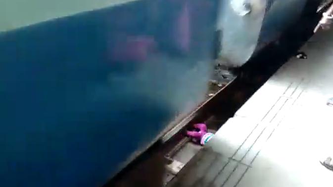 Kombinasi gambar dari video pada 20 November 2018 menunjukkan peristiwa ketika bayi perempuan terlepas dari gendongan ibunya dan jatuh ke rel saat sebuah kereta melintas di atasnya di stasiun kereta api di Mathura, Uttar Pradesh, India. (NNIS / AFP)