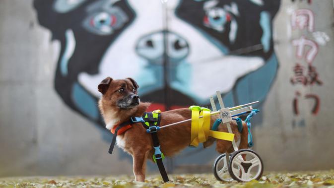 Yangyang, anjing menggunakan bantuan roda untuk berjalan, bermain dengan anjing lain di penampungan hewan di Shenyang, China, 13 November 2018. Anjing liar itu diselamatkan 2 bulan lalu dan menerima roda khusus dari shelter untuk berjalan. (STR/AFP)