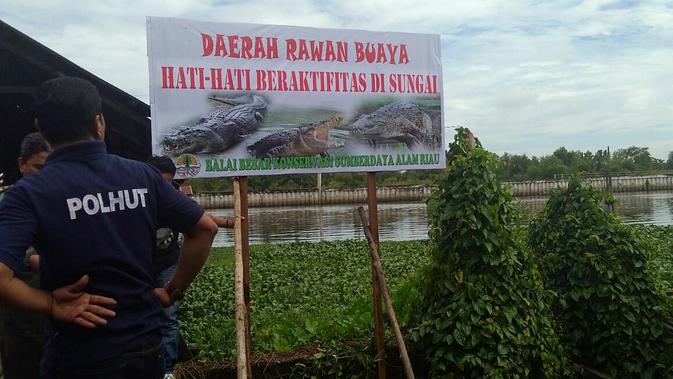 Liputan6.com, Pekanbaru - Balai Besar Konservasi Sumber Daya Alam (BBKSDA) Riau memasang plang tanda adanya buaya di tepi Sungai Siak, Kecamatan Senapelan, Kota Pekanbaru. Hal ini sebagai peringatan bagi masyarakat agar tidak adanya korban jiwa karena dua ekor buaya sering muncul di Tanjung Leok.