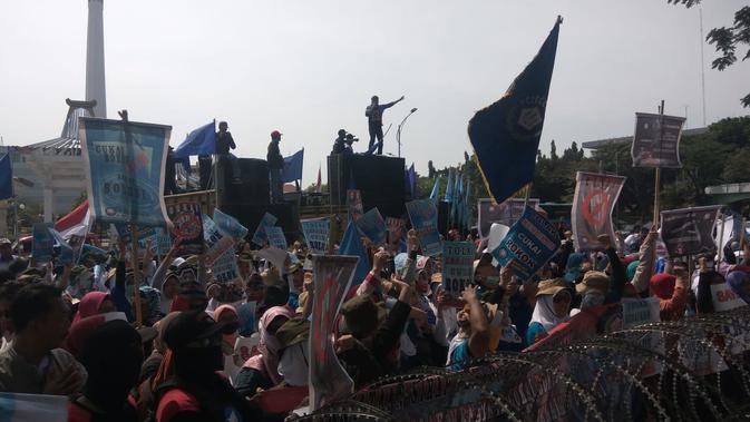 Buruh melakukan demonstrasi kenaikan UMR di depan pintu tol Rawamangun. Akibatnya kemacetan panjang tidak bisa dihindari pengguna jalan.