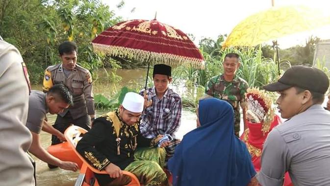 Liputan6.com, Aceh - Tim gabungan yang terdiri dari personel TNI/Polri, BPBD, bersama Search and Rescue (SAR) Aceh Selatan melakukan aksi heroik. Mereka rela basah-basahan demi menolong dua mempelai pengantin yang melangsungkan pernikahannya di tengah banjir.